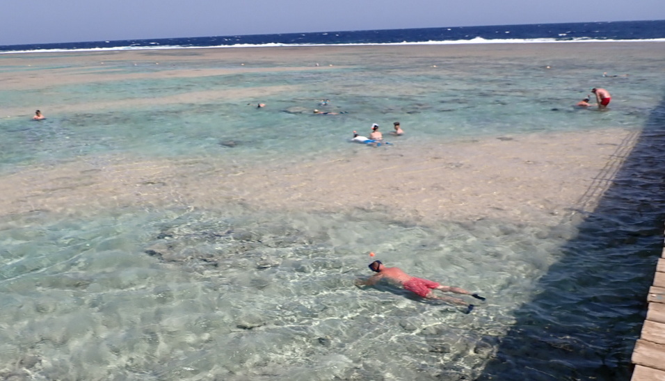 A strandon, a homokos parttól a víz felé a tenger sekély. Igaz köves, ezért gumicipő viselése erősen ajánlott. Veszélyes állat, medúza, tengeri sün itt nem él. A partközeli részben az apróságok is zavartalanul élvezhetik a fürdőzést. A mélyebb részhez vezető híd mellett jócskán be lehet gyalogolni és még a felnőttnek is csak térdig ér a víz. A halakat szabad szemmel is megfigyelhetjük, közel jönnek, nem félnek az embertől – igaz nem is bántja őket senki. A híd végén, a lépcsős lejáratnál mindig van – olykor két őr is - ha menteni kellene a sznorkelezők egyikét. A biztonságérzetet növeli egy fontos szabály: anélkül senkit sem engednek a mélyvízbe, hogy egy füzetbe be ne írná a nevét, a szobaszámát, és a vízbe menetének időpontját. Amikor valaki kijön, az őr a nevéhez beírja, mikor jött vissza.