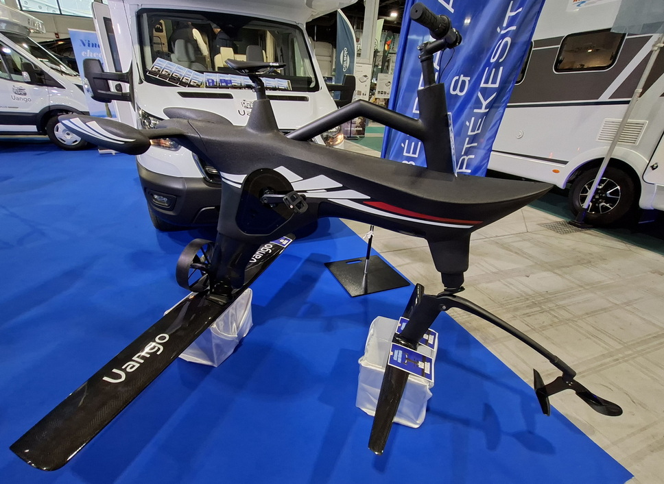Azt azért nem mondjuk, hogy egyáltalán nem volt érdemes kijönni. Mindjárt a lakóautók tengerének elején rábukkanhattunk egy érdekességre. A VANGO Kft. lakóautó bérbeadással és értékesítéssel foglalkozik. Ők hoztak egy vízi e-biciklit, ami hidrofoil megoldással, már az indulásnál fennmarad, lebeg a víz tetején. Az utas ráül, elkezdi tekerni a pedált, ezzel meghajt hátul egy propellert. Van benne egy elektromos motor, az is mindjárt elindul. A hátsó 2 m széles, az első 1 m széles hidrofoil szárny a sebesség hatására kiemeli a gépet a víz felszínére. Úgy, 15 km/óra sebességgel tud a vízen haladni. Legfeljebb 3 órán keresztül bírja az akkumulátor, a terheléstől, tehát az utas súlyától függően. Ha van tartalék akkumulátor, akkor egy mozdulattal ki lehet cserélni, otthon feltölthetők. A használatához a Balatonon engedély nem kell.