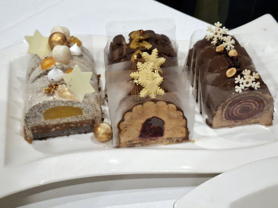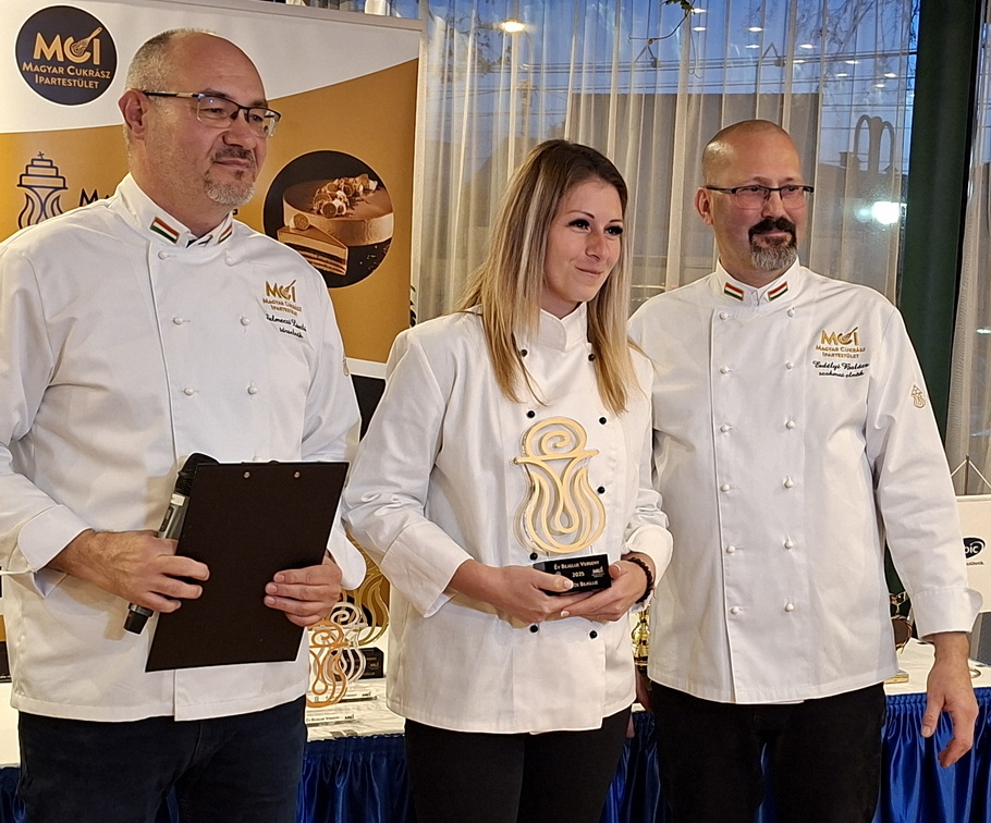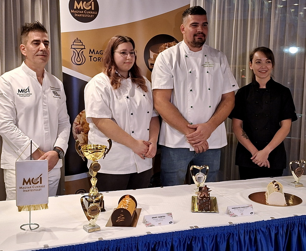 Képünkön az első három díjazott, a helyezések sorrendjében balról jobbra látható. Aranyérmes: ARANY CSÁBÍTÁS – FÜREDI KRISZTIÁN – HISZTÉRIA CUKRÁSZDA, TÁPIÓSZECSŐ. Ezüstérmes: Varázslatos karácsony - Varga Izabella és Novák Ádám – Reök Kézműves Cukrászda és Kávéház, Szeged. Bronzérmes: Vérnarancs, kávé, mogyoró - Törő Anett - Hotel Essence*****, Pogány. Az Arany csábítás, mandulalisztes kakaós felverten, narancsos ropogós réteggel, karamellizált csokoládé- és narancsos tejcsokoládé mousse-szal készült különlegesség. A Varázslatos Karácsony, mandulalisztes piskótával, mandulás csokoládés ropogós réteggel, fűszeres vilmoskörte zselével és tejcsokoládé mousse-szal készült fatörzs torta. A Vérnarancs, kávé, mogyoró, pedig a nevében is hordozza ízeit, mogyorós joconde felverten, törökmogyorós mandulás kávépralinéval, mogyorós kávés ropogóssal, vérnarancs zselével és cremeaux-vel, kávés fehércsokoládé namelaka-val és narancsos fehércsokoládé mousse-szal készült fatörzs torta.