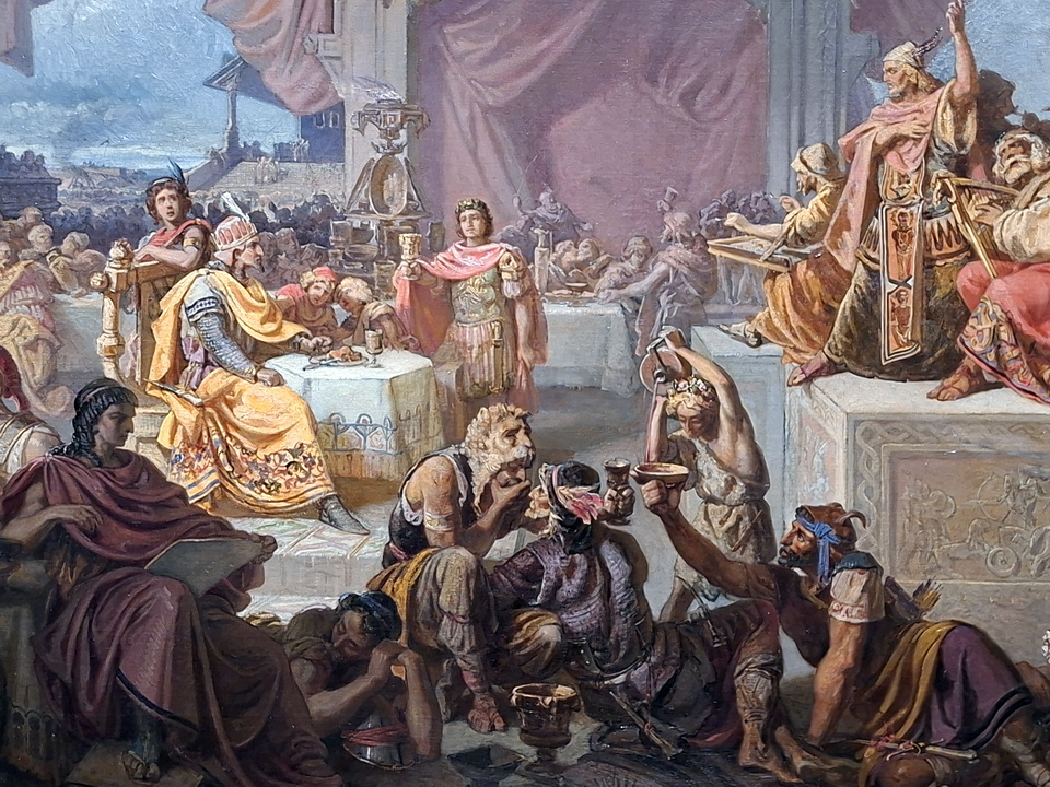 Viszont a galliai és itáliai emlékezet, a Balkán földúlása, eleven nyomokat hagyott, hun ellenes sebeket ejtett. Ami ott tragédia, számunkra lehetne Anonymustól és Kézai Simontól kiinduló dicsőség – magyarázva az Árpádok ősapja mesét. Árnyalva a vadság történetét, megjelenik az I. Nagy Szent Leó pápával való találkozás, mely 452-ben valóban megtörtént, de a részletek körül több a legenda, mint a bizonyított tény. Számunkra ezt a kiállítás legnagyobb műtárgya, „Nagy Leó találkozása Attilával Róma falai alatt” című festménye teszi hangsúlyossá. A monumentális, több mint 4 x 6 méteres festmény, másolat. Haan Antal 1874-81 között a Vatikánban másolta le Raffaello három Stancáját, köztük ezt is – közel eredeti méretben. Attila 452-ben sikeres hadjáratot vezetett Itáliában. Róma város békét kérő követségének volt tagja a pápa, valószínű, hogy a kegyelem ára dófizetés lehetett.