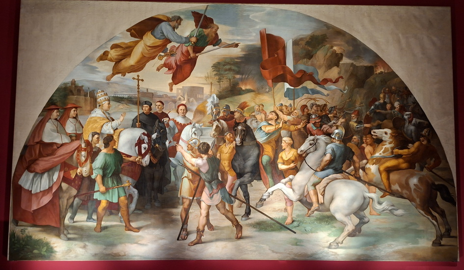 Százhúsz év után most először láthatja a hazai és a nemzetközi közönség ezt a képet, de sokkal közelebbről, mint a Vatikánban. Tehát jobban meg lehet vizsgálni. Jó egy évnyi komoly restaurátori munka eredménye, műszeres méréseket is végeztek, mivel hosszú évtizedeken keresztül fel volt tekerve. Most szinte teljesen újszerű állapotban látható. Persze érdemes a történeti pillanatot is elképzelni, vagy legalábbis picit elemezni. Raffaello a szereplőket - Attilát tévesen, pikkelypáncélt viselve - a festés korának megfelelő ruhában ábrázolta. Ezért raktak a rendezők most a kép mellé egy egészen máskor keletkezett szarmata páncélt. Akkoriban ebbe a viseletbe képzelték. Hasonló eltéréseket látni a kiállítás számos más pontján. Hogy amikor előkerülnek leletek a régi korokból, akkor azokat felhasználva helyezik bele az ismert szereplőket a régi időszakba.