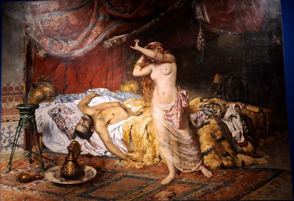 Mindez megmutatkozik egy másik, ugyancsak híres képen. Mint egész életét, úgy Attila halált is több, különféle legenda övezi. Paczka Ferenc 1884-ben erről festet képe nagy feltűnést keltett, de nem az uralkodó naturalista módon festett holtteste, hanem a főszereplővé tett Ildikó szexualizált bemutatása miatt. Ma pontosan látjuk, a festő csalt: a képen olyan részletek szerepelnek, amik nem léteztek Attila korában. A kiállítás rendezői itt is gondoskodtak arról, hogy a képet nézve, bal oldalon a falon, illetve mellette egy tárlóban sorakozzanak a bizonyítékok. Az ágynál álló háromlábnak támasztva hever egy bárd. A szomszédos vitrinben is ott van, a XIX. század eleji perzsa dervis bárd. Nem hun, nem ókori. A falon ugyancsak egy XIX. századi szőttesminta látható, pont olyan mintákkal, mint a képen, az Attila ágya melletti kárpiton. Sok ilyen érdekes ismerettel gazdagodhat, aki július 12-ig felkeresi a Nemzeti Múzeum valóban párját rikító legújabb kiállítását.