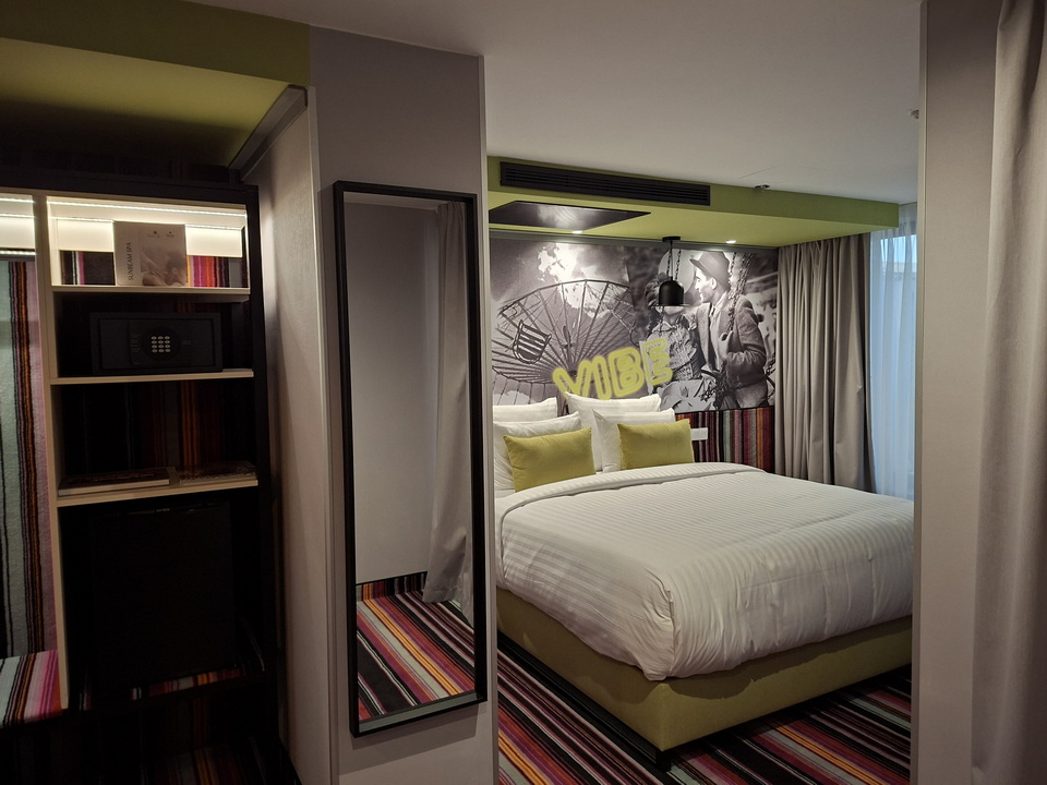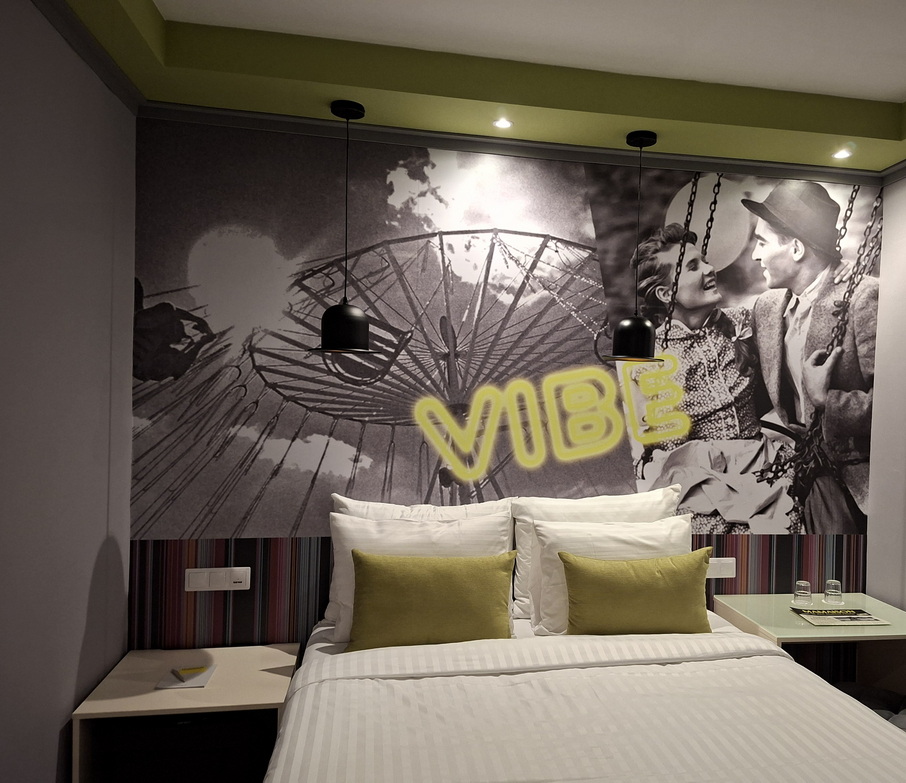 Kezdjük az újabb szálloda történetével! A ház mindössze néhány hónappal ezelőtt, 2025. december 18-án nyitotta meg kapuit. A belsőépítészeti kialakítást ugyancsak Varró Zoltán tervezte, hasonlóan a szomszédos testvérszállodához, a Lánchidunkra emlékeztető Chain Bridge-hez. A névválasztás most sem véletlen, a „vibe” szó jelentése: hangulat! A hotelben 96 szobát alakítottak ki, melyek mindegyike a 60-as, 70-es és 80-as évek stílusvilágát idézi, de azért találunk közöttük lényeges eltéréseket is. A 106-os szoba például egy különleges „standard” egység. A tervezésnél gondoltak arra, hogy sok olyan ember van, aki allergiás a porra, nem tud olyan helyen lenni, ahol szőnyeg, illetve egyéb kárpitozott berendezés van. Így ebben a szobában nincs szőnyeg vagy más kárpit, tehát itt az érzékenyebb vendégek is teljes kényelemben pihenhetnek.