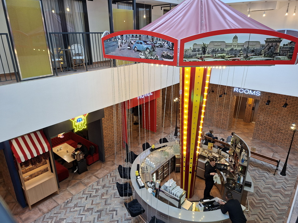 A földszinti – az étteremmel, a reggelizővel egybeépült - lobbiban a recepciós pult két hatalmas Rubik-kockát formáz. A közösségi tér központi eleme viszont a Körhinta bár, ami az emeletekről is jól látszik. A falakon a régi Budapesten ismert neonfények itt értelmet is nyertek. A reggelihez a Közértnél találhatók az italok, a Csemegénél a kávé. A reggelizőnél van egy kisebb színpadrész, ahol előadásokat lehet tartani. A közelében a kis játéksarok, flippergéppel, csocsó asztallal, a vendégek kedvence. A pultnál kapható összes koktélt a szálloda bártenderei kreáltak. Az összetevőik között akad olyan, aminek még a nevét se nagyon hallottuk. Például a Délkelet-Ázsiából származó citromnád rendkívül sokoldalú, a konyhától a gyógyászatig mindenhol megállja a helyét. A thai, vietnámi és indonéz konyha egyik alappillére. Frissítő hatású, de teába, koktélokba és limonádékba is kiváló. Már csak ennek megkóstálása miatt is érdemes ide ellátogatni.