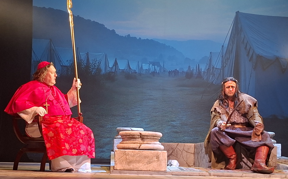 A második felvonás még tartogat meglepetést, elgondolkodni valót a nézők számára. A két főszereplő egyik további társalgása során fény derül Jézus kétféle megítélésének mibenlétére. Az arianusok szerint Jézus a legnemesebb teremtmény, de nem Isten, „Volt idő, amikor nem volt”. Attila szerint a szeretet a szkíták legtitkosabb fegyvere, erejével újjá lehet építeni a világot. Néha ölni kell, hogy élhess, de légy kész a kegyelemre! Az idő végtelen országútján vándorló ősi szkíta népnek örökre el kell tűnnie, mert vérrel tisztította meg az utat a szeretet birodalom előtt. Megállapítja: Itáliában és egész Európában Jézus Krisztus uralkodik, de nem lehet kétféle Jézusuk, mert akkor az kettészakítja a világot. Jézus nevében fogják egymást öldökölni az emberek. A színházban ülők viszont pontosan tudják - ez nem monda, ez be is következett. El tudjuk-e kerülni, hogy újból megismétlődjön?